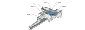 Ce seuil-bassin, d’une longueur de 12 mètres et d’une hauteur de 4 mètres, est associé à un bassin de rétention d’environ 36 m³. L’ensemble est complété par des radiers et des glacis, permettant de faciliter la collecte des eaux pluviales et de limiter l’érosion autour de l’ouvrage.