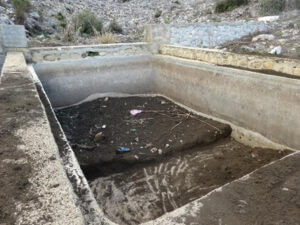 Nettoyage en cours du bassin SB4 de la ravine Fond Dégât par un groupe de femmes de La BorneCiterne CF1 de Haut Barbe. L’eau disponible est utilisé par les enfants de Dieusibon- Dorsélan et ceux des habitations proches pour se laver avant d’aller à l’école le matin