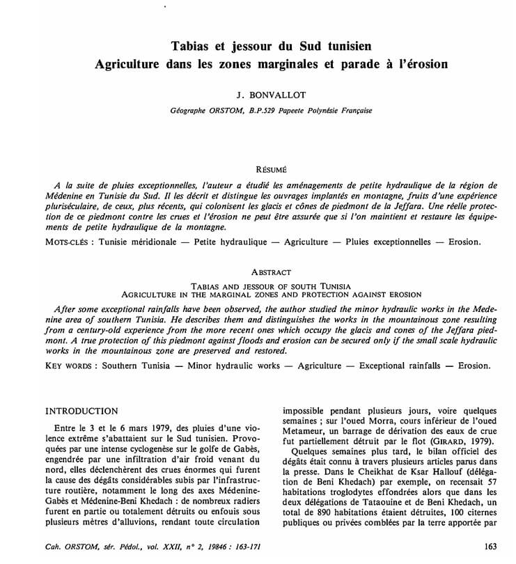 A la suite de pluies exceptionnelles, l’auteur a étudié les aménagements de petite hydraulique de la région de Médenine en Tunisie du Sud. Il les décrit et distingue les jessours implantés en montagne, fruits d’une expérience pluriséculaire, des ouvrages, plus récents, qui colonisent les glacis et cônes de piedmont de la Jeffara. Une protection de ce piedmont contre les crues et l’érosion ne peut être assurée que si l’on maintient et restaure les équipements de petite hydraulique de la montagne.